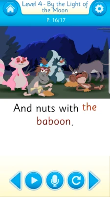 The first three books on every shelf are read-to-me stories. The stories are read aloud while the child follows along. The fourth book allows the child to practise reading, using the vocabulary from the stories just read. The record feature allows the child to record him or herself reading the story and play it back.