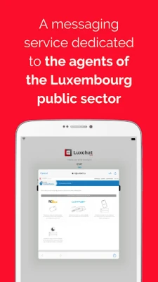 Luxchat4Gov is operated in Luxembourg, and, for maximum security, communications are end-to-end encrypted. Employees from the public sector can share text messages, documents, pictures, and videos bilateral or in group, public or private "chat rooms". They can also call another user, with or without video, share their location and much more.