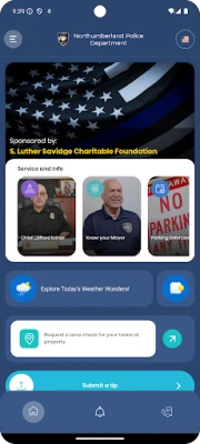 Real time notifications from the Northumberland Police Department for announcements such as road closures, safety threats, weather alerts, etc.. Know your Cheif Ability to submit an anonymous tip with a photo or video as well as the ability to mark your location with GPS services Know your Mayor Jobs/Recruitment Other city services Crime prevention Praise or complaints Events Victim services Access to the Northumberland Police Department website and Facebook page